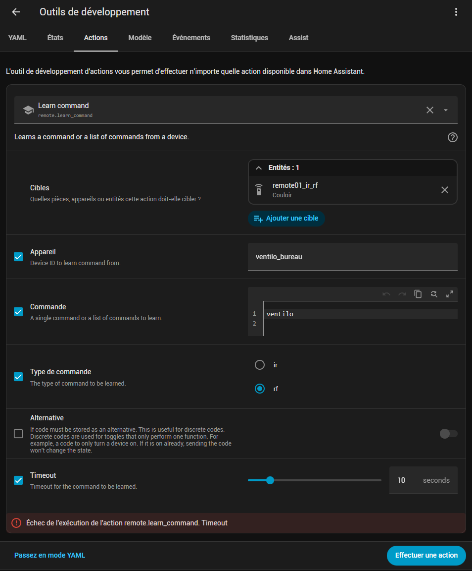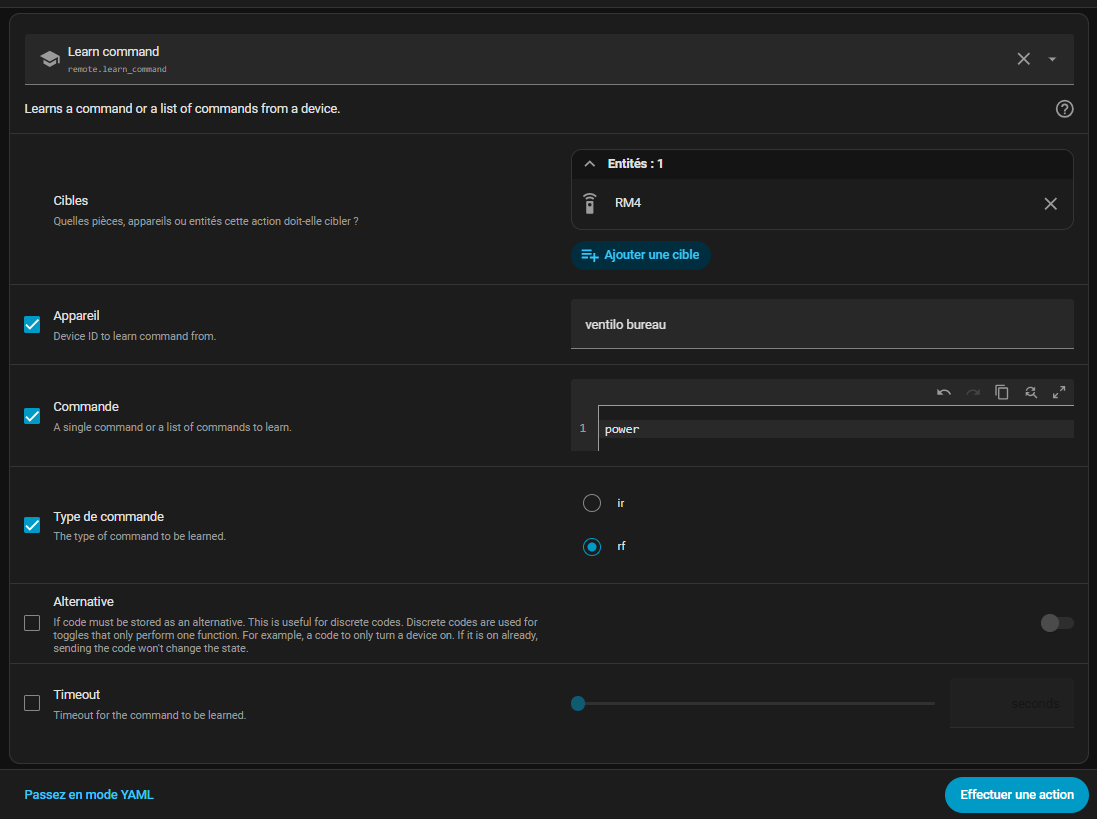 essaye sans l’option timeout cochée. Oui, dès que tu exécutes l’action, une lumière sur le IR remote s’allume et là tu fais l’action de la télécommande.