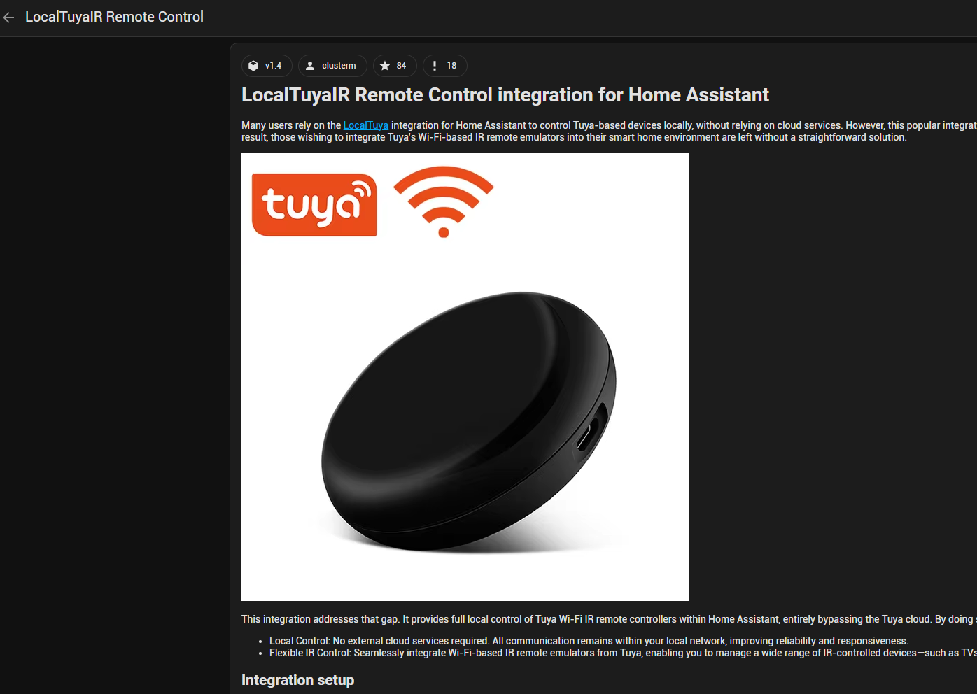 Les hubs infrarouges Tuya qui exposent les télécommandes infrarouges standard comme sous-périphériques les présentent généralement comme des périphériques unidirectionnels (émission uniquement). Du fait de la méthode de détection des périphériques basée sur le nombre de signaux par seconde (dps) renvoyés par le périphérique, cette intégration est actuellement incapable de détecter ces périphériques. Certains hubs infrarouges spécialisés pour les télécommandes de climatiseurs fonctionnent, car ils tentent d’émuler un climatiseur intelligent en utilisant la mémoire interne des réglages actuels, ainsi que des capteurs internes de température et d’humidité.