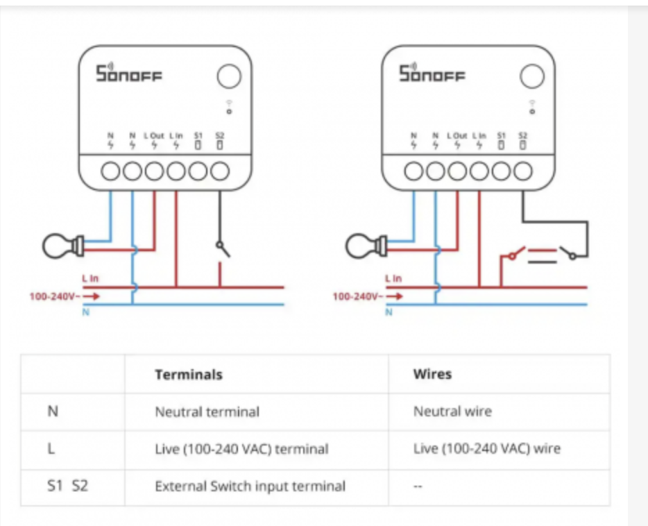 Bonjour. J’ai un souci avec le module Sonoff que j’ai acheté. J’ai 3 boutons poussoirs pour mon couloir. Derrière l’un des interrupteurs où je peux mettre mon module Sonoff j’ai 2 fils qui arrivent, un bleu branché sur la borne rouge du bouton poussoir, l’autre violet branché sur la borne noire du bouton poussoir. J’ai essayé de mettre le fil bleu en Lin et le violet en L2, et ai relié S1 et S2 à l’interrupteur; Que je me mette en mode bouton poussoir ou interrupteur, quand j’appuie la première fois cela active la lampe mais je dois appuyer une 2° fois pour que la « commande » s’arrête… Javais essayé aussi avec un smart module Gifrier piloté par Smart Pilot et c’était pareil, que je me mette en position interrupteur ou bouton poussoir… Quelqu’un aurait-il une idée ?