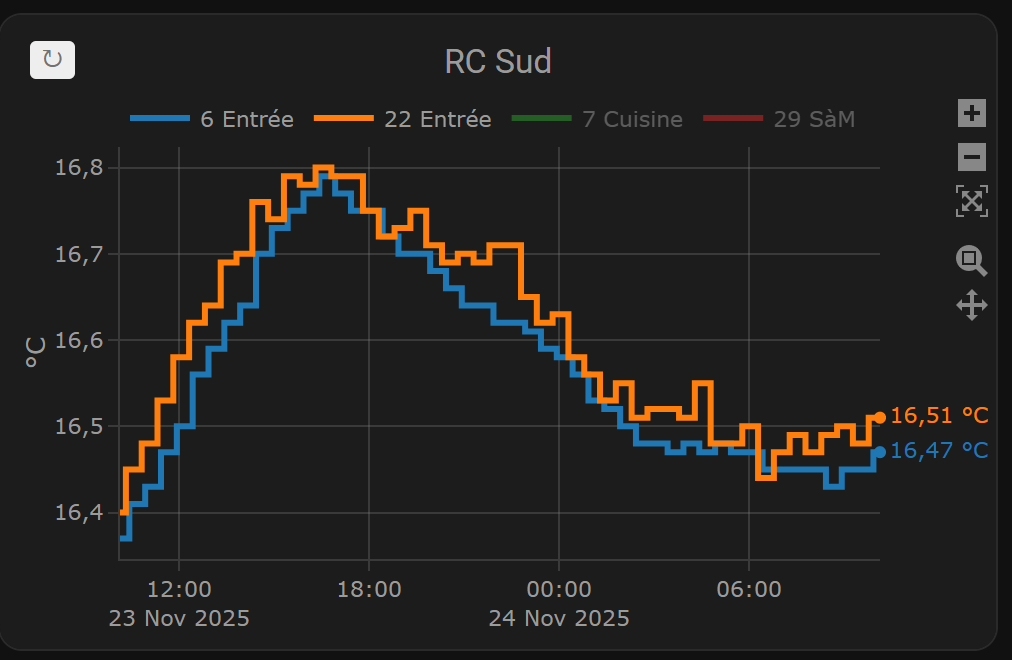 Mon test de réactivité est la détection de douche. Je place le capteur au plafond au dessus de la douche. Là on voit que la douche est parfaitement détectée par un énorme pic d’humidité sur la courbe orange de la SdE. Ce capteur peut donc être utilisé pour contrôler une VMC par exemple.