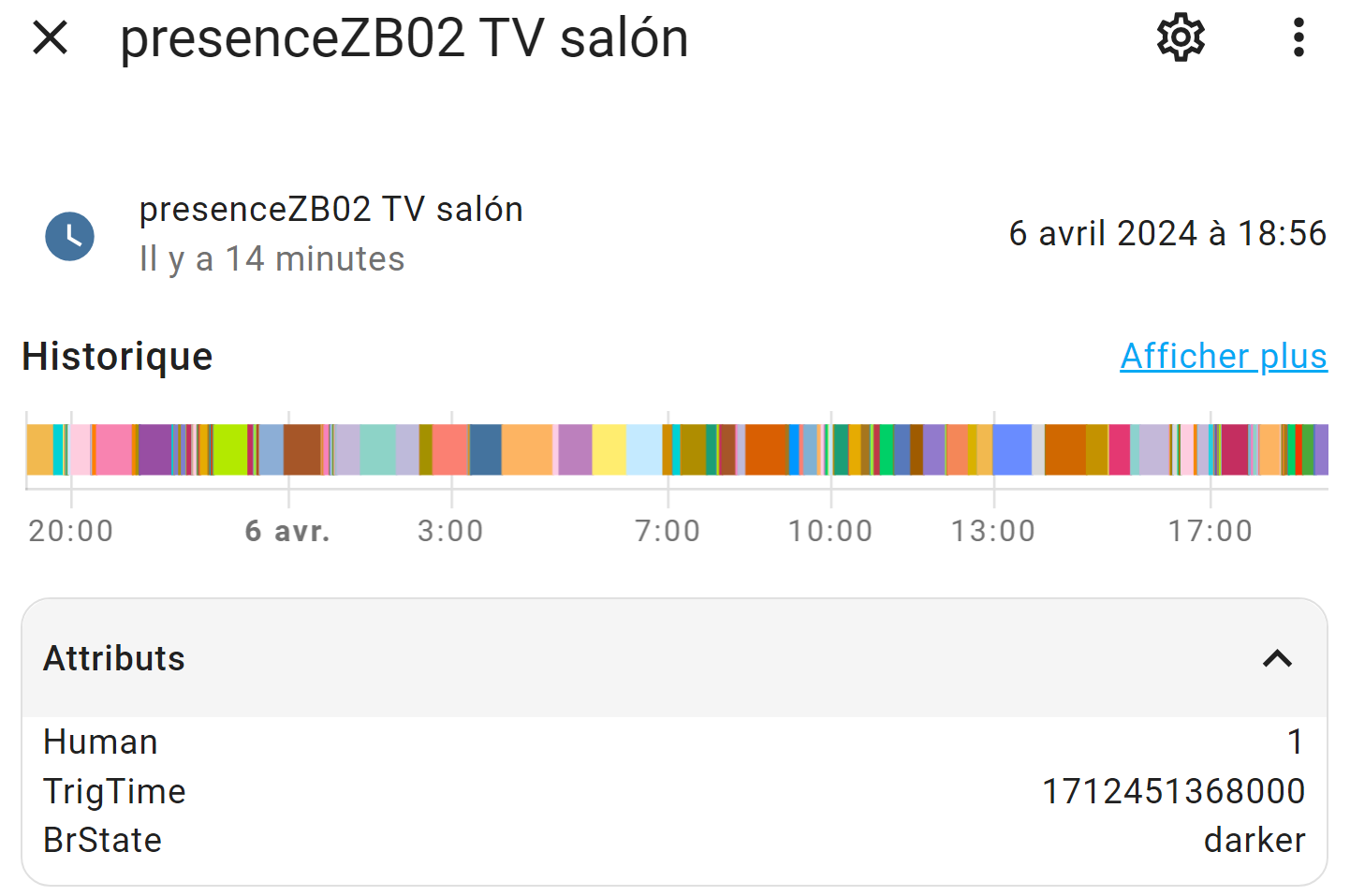 Et avec z2m, je n’ai que les mouvements et l’illumination, mais pas la présence statique (pas grave, je bosse sur les LD24xx en ce moment, mais quand même…) :