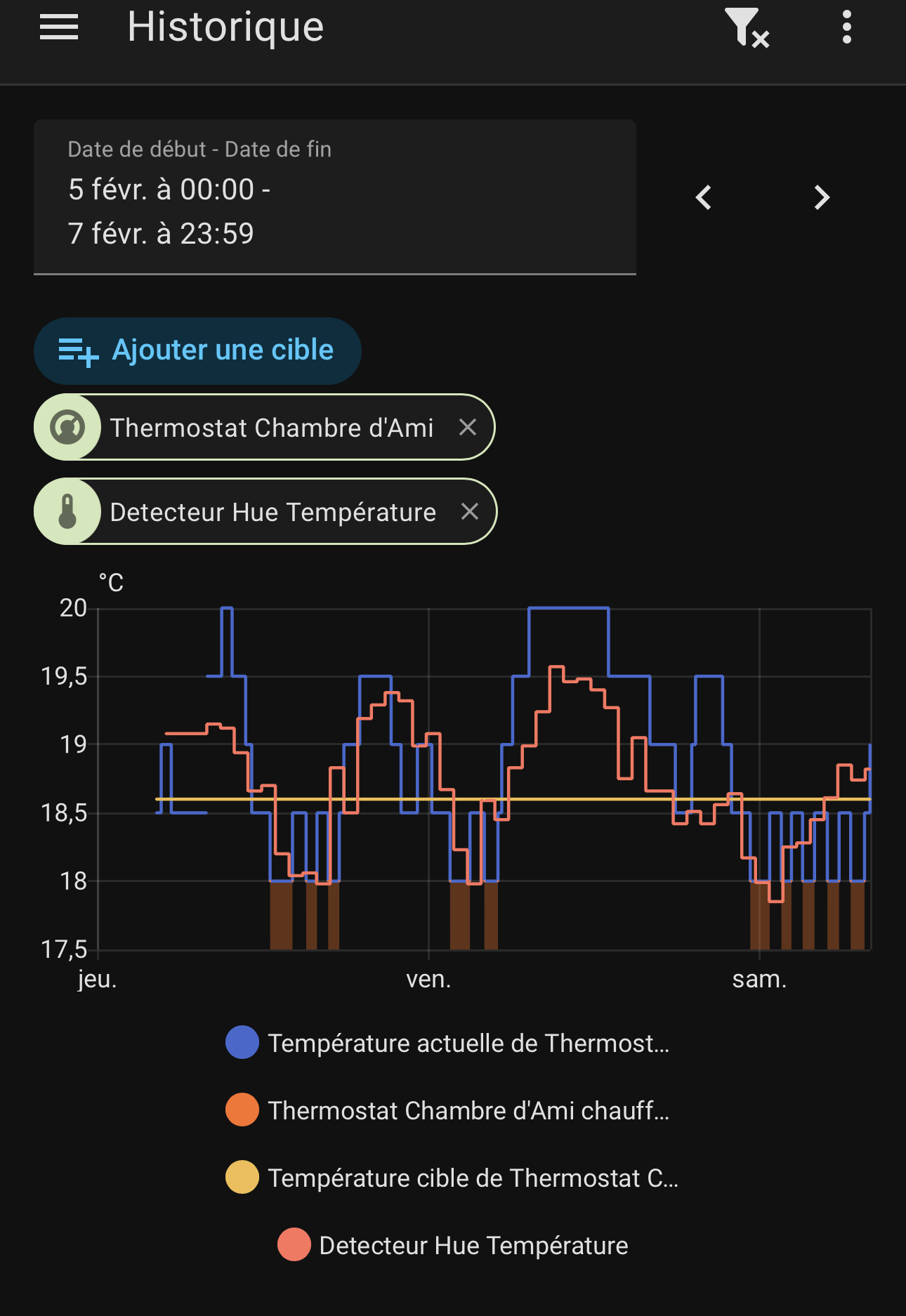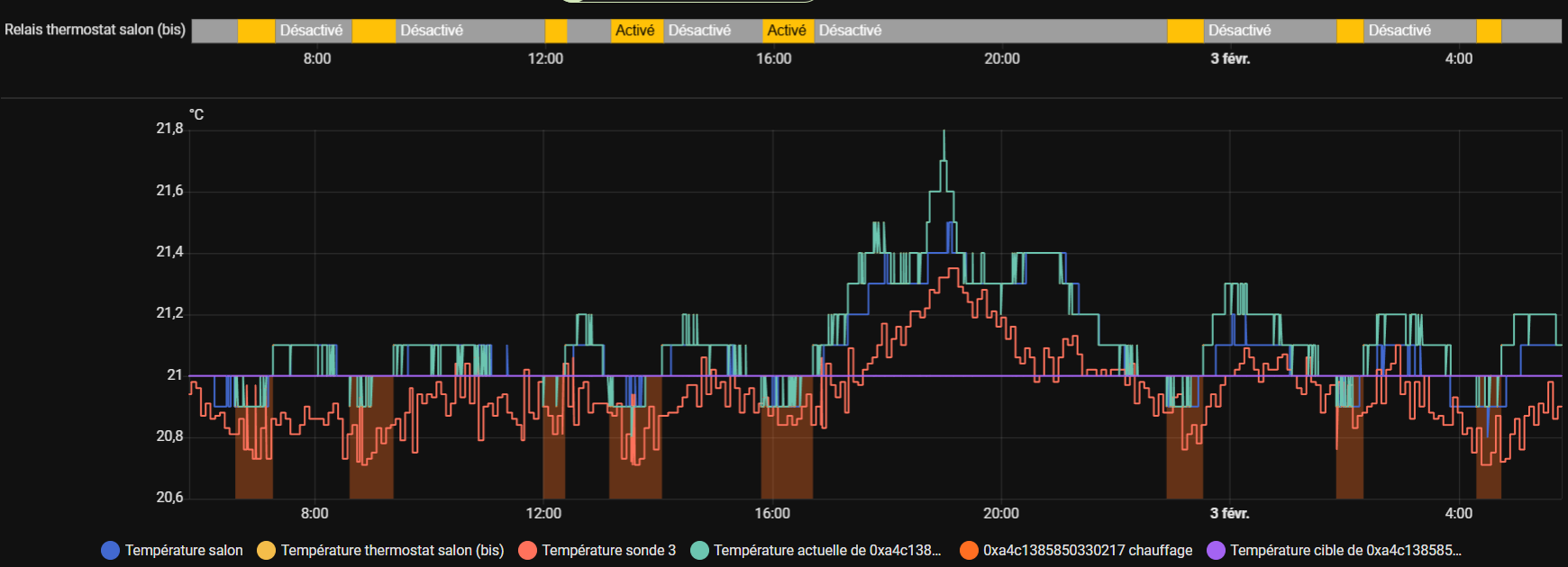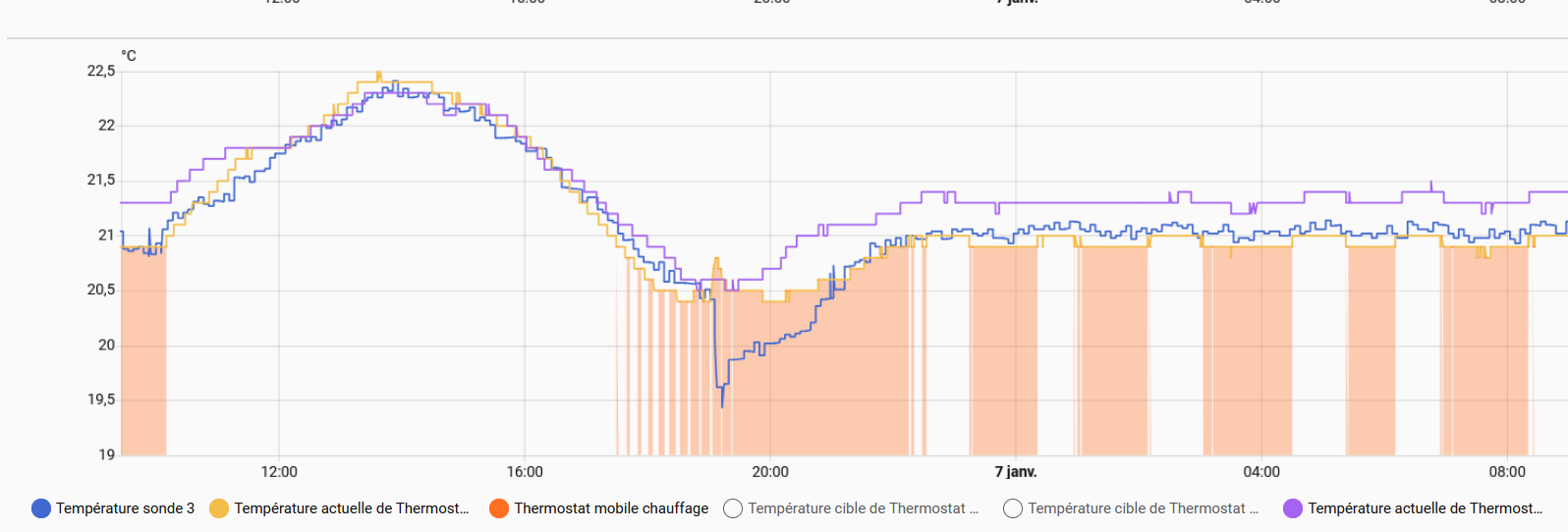 Troisièmement, certes il y a eu une perturbation (changement de consigne -1°C), mais on remarque que le thermostat filaire a vraiment du mal à réguler, sans aucun doute du fait de son imprécision de mesure, et on peut donc observer le phénomène de pompage dont je parlais (chute à -0.7°C, puis remontée à +0.3°C par rapport à la consigne, cela fait une incertitude de ±1°C, ce qui est perceptible, croyez-moi !).