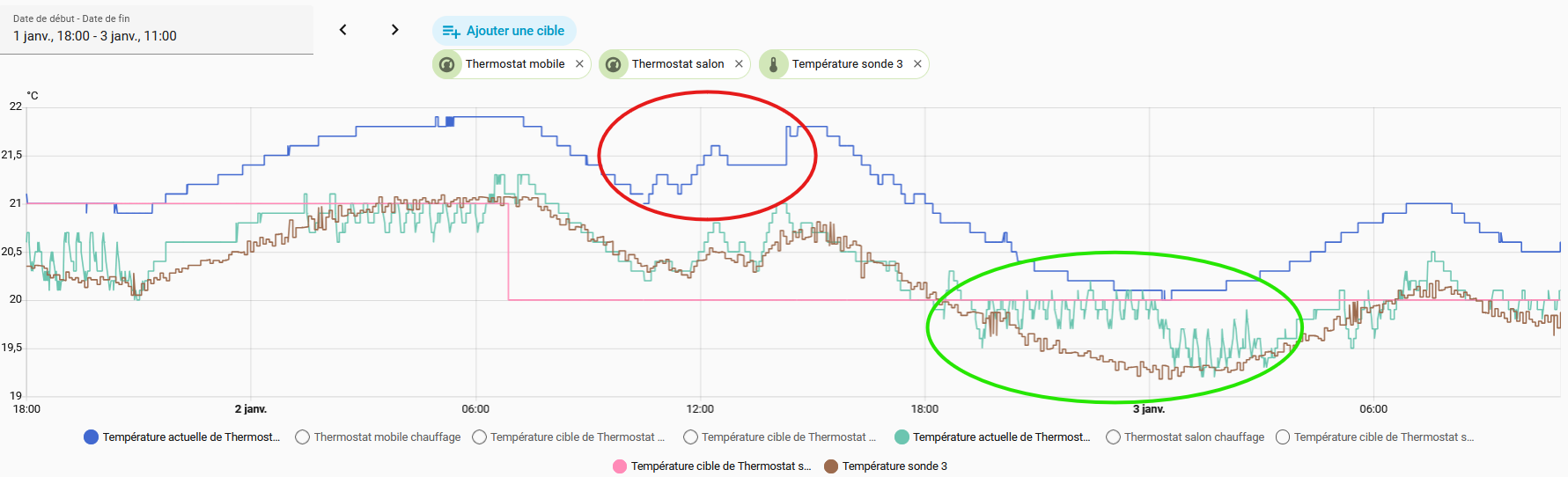 En premier lieu, la mesure du thermostat filaire. Elle est vraiment trop imprécise et perturbée. Je n’ai pas affiché les périodes de chauffe, mais soyez assuré que chaque pic correspond à un enclenchement du relai interne. Sans compter que dans la zone entourée en vert, la mesure est en décalage constat de 1/2 degré avec la sonde.