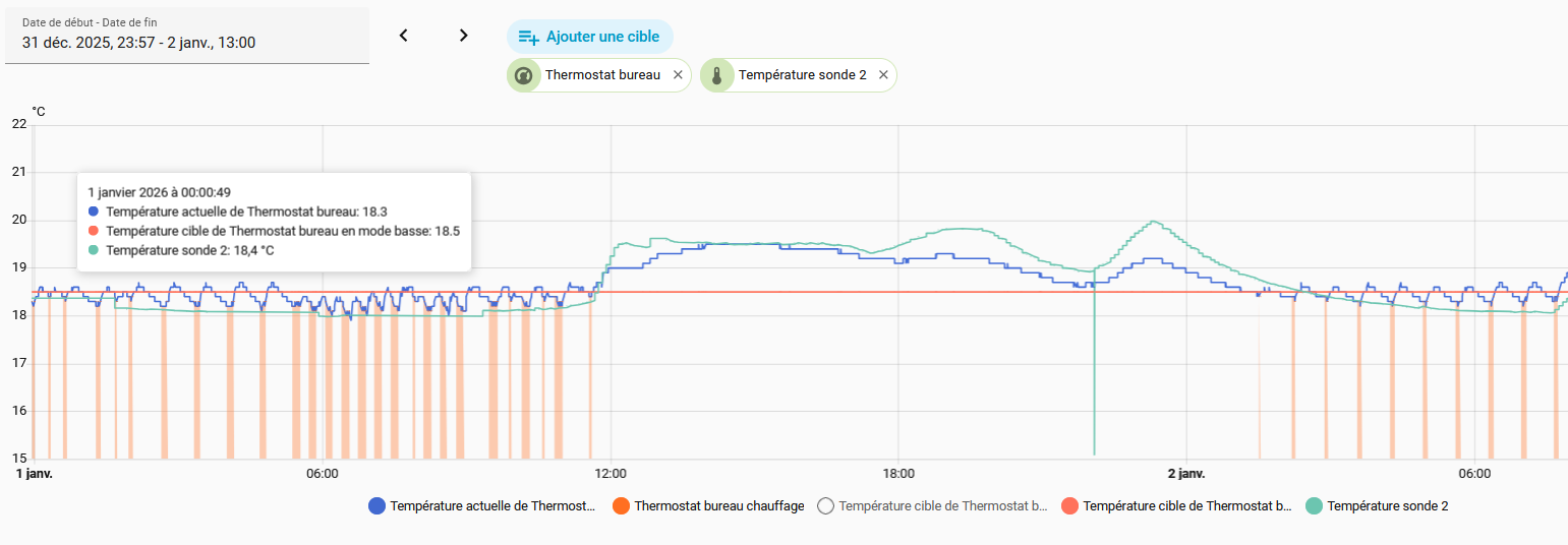 Le thermostat (filaire) fonctionne parfaitement ! Certes, il se perturbe lui-même (ne pas tenir compte de la zone entre 12h et le 2 janvier : entre le soleil et un coup de clim réversible pour une montée rapide en température, j’ai complètement faussé les mesures). Mais on constate que ces perturbations n’ont pas engendré de pompage, et que la température s’est rapidement stabilisée.