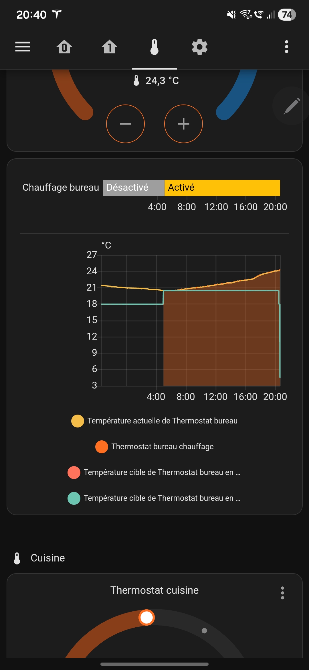 Je vais continuer à gratter, notamment cette histoire de palier. Mais il me faut trouver un gestionnaire fil pilote 5-6 zones pour pouvoir piloter les radiateurs du palier (il n’y a pas 6 radiateurs, mais j’ai d’autres zones que je ne pourrai piloter que par fil pilote)