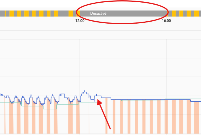 Deuxièmement, la zone entourée en rouge. Pendant une heure, le thermostat à pile n’a pas envoyé de valeur (et pourtant, la sonde a bien enregistré des variations de température).