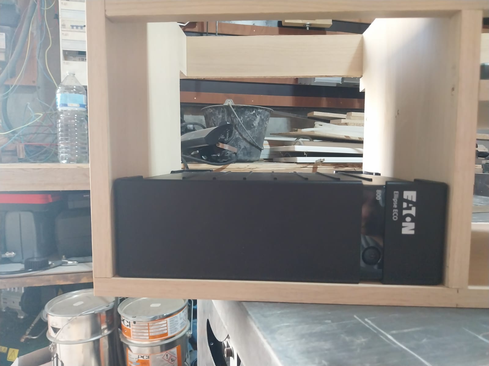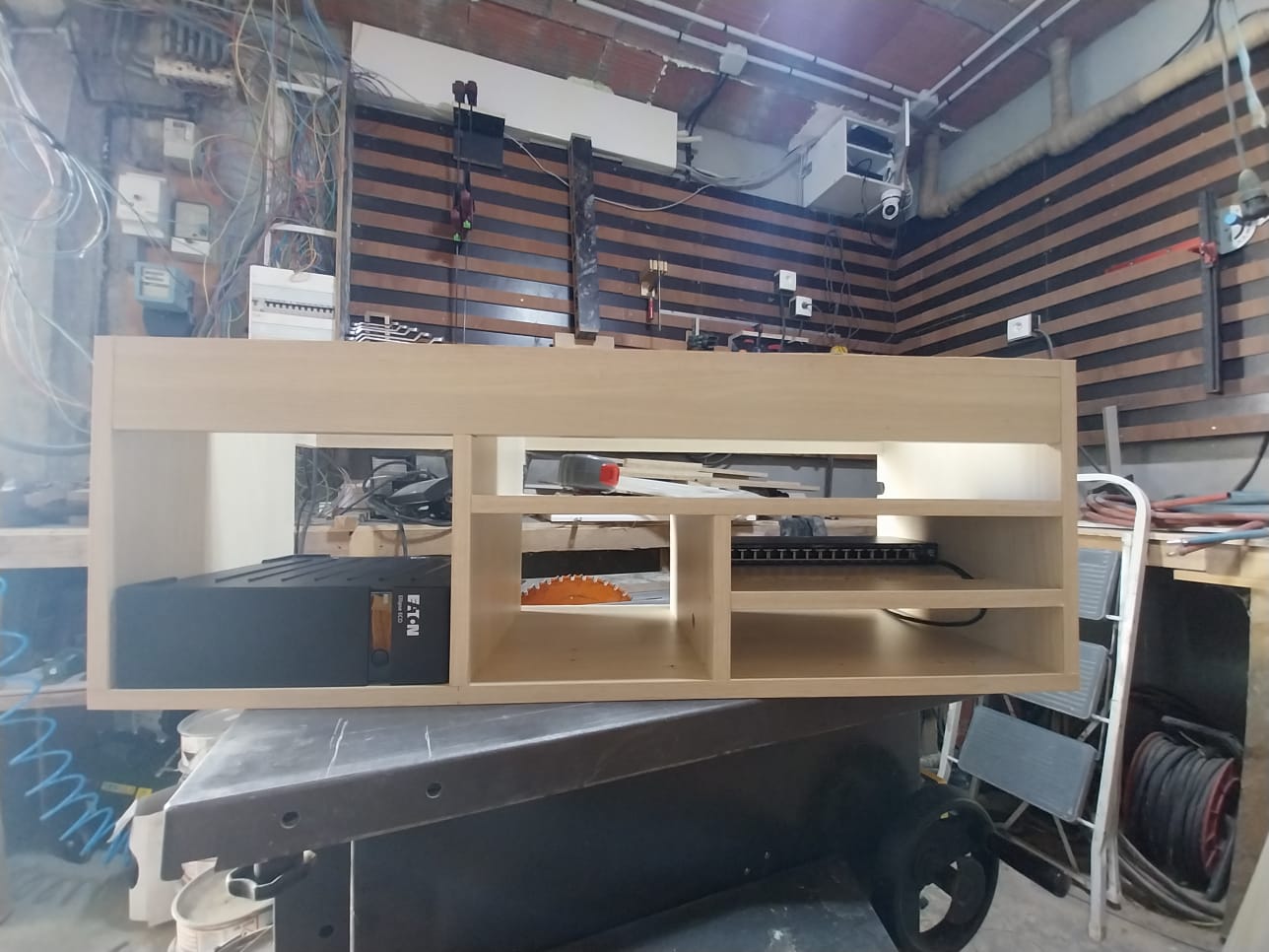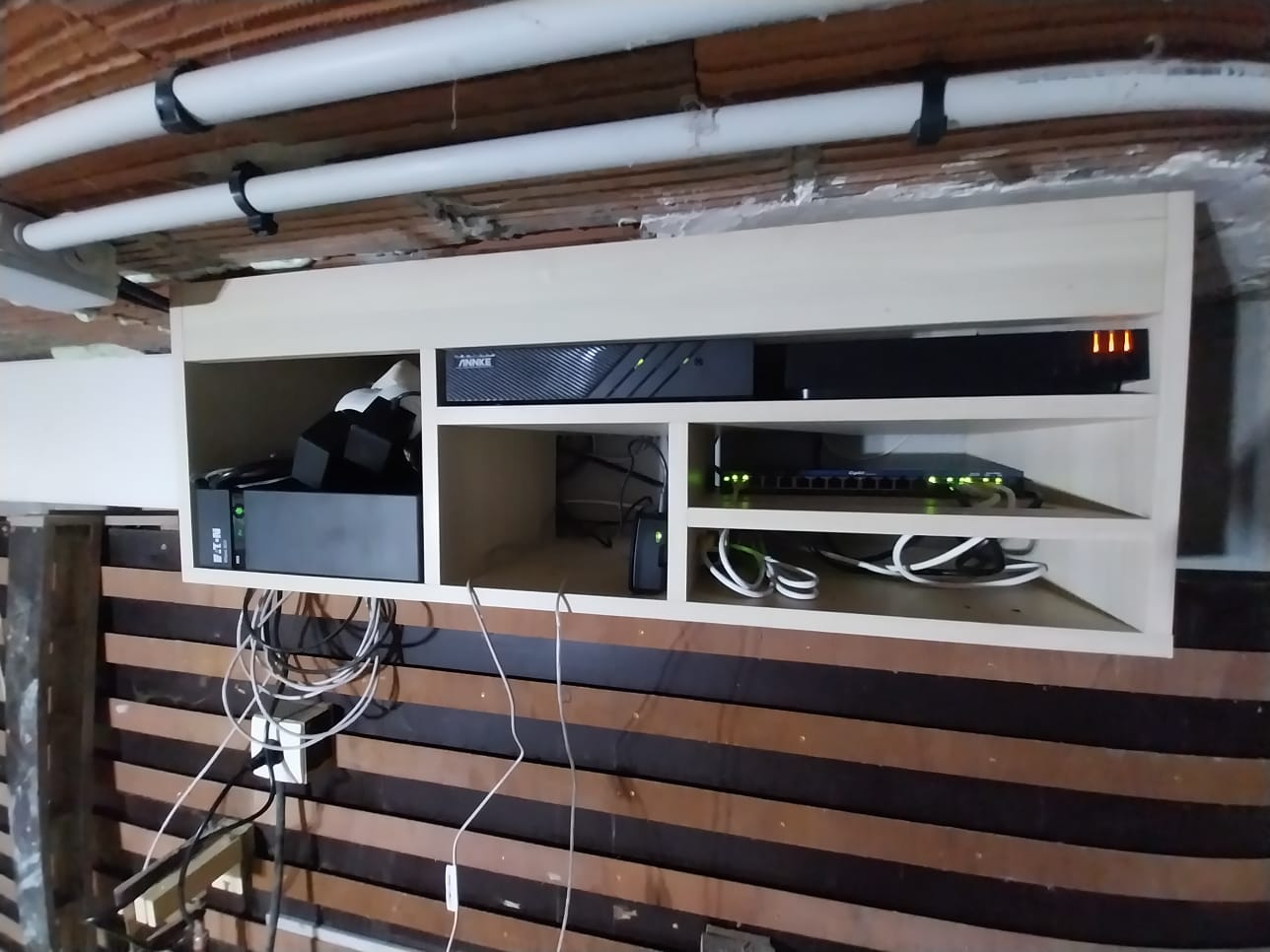 Du coup la petite baie a été installée dans le garage ou j’ai 1 panneau de brassage, 1 bandeau de prises 230V, 1 plateau avec le switch POE+ et l’injecteur du pont radio, un onduleur 650VA.