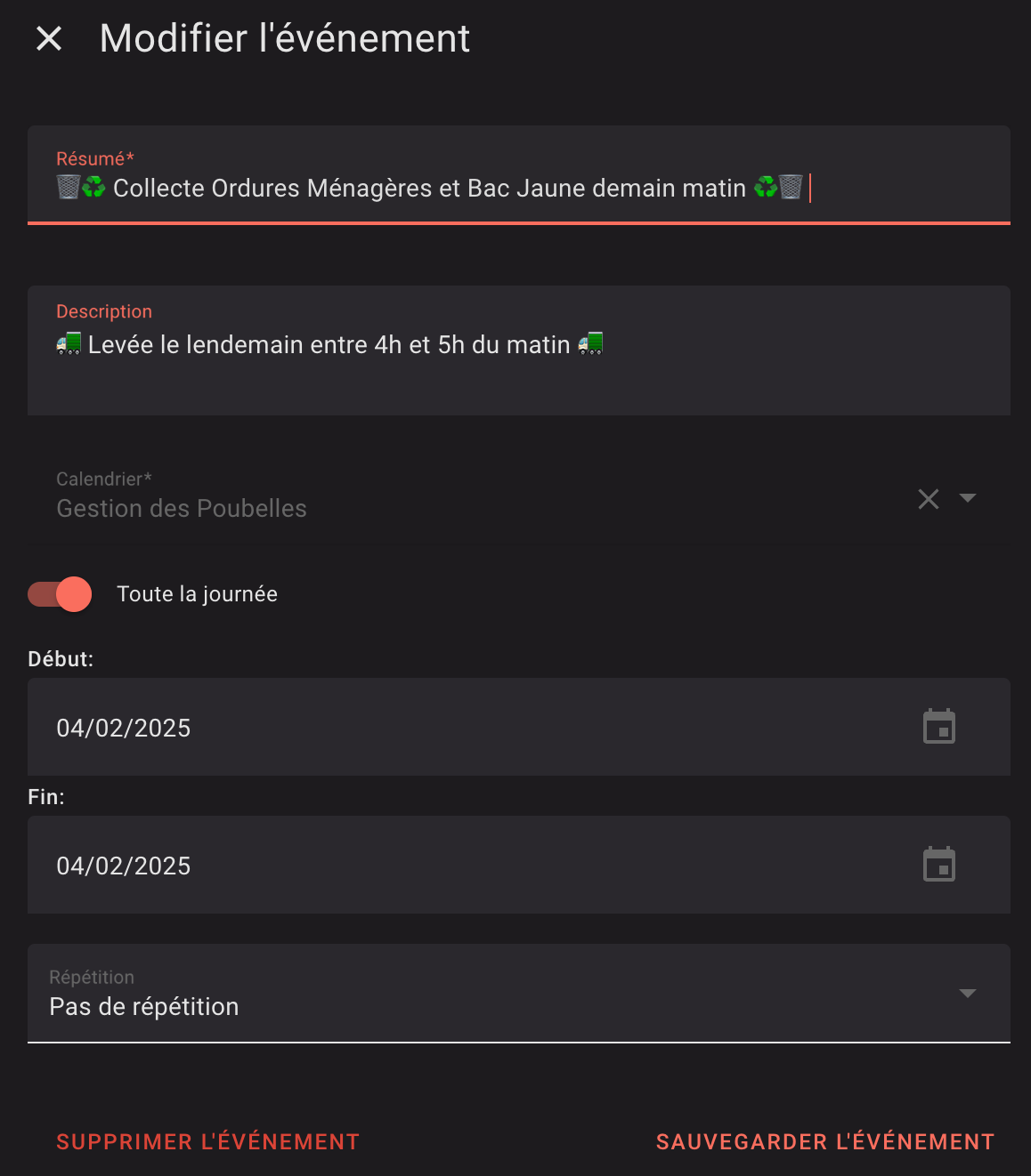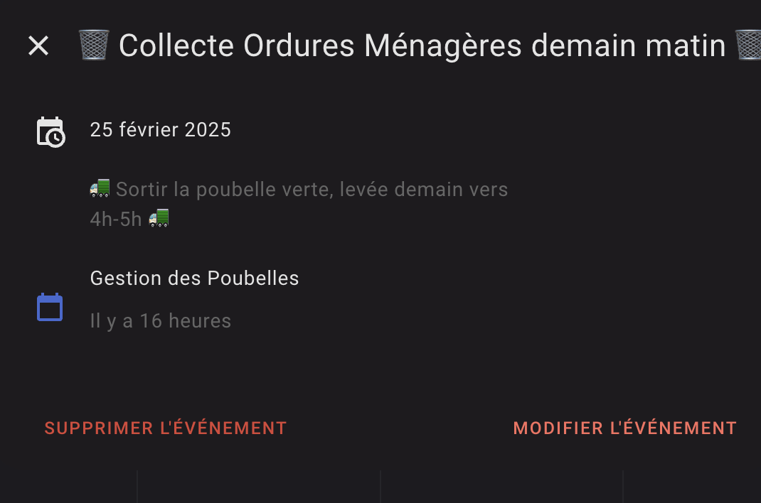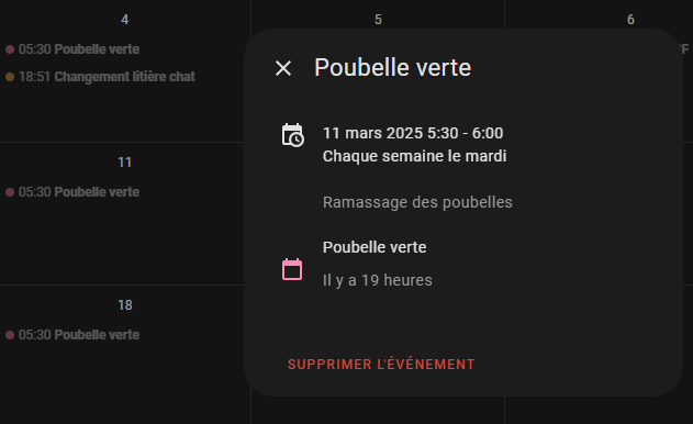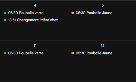 J’ai mis un événement journée la jour de la levée des poubelles , qui a lieu entre 4h et 5h du matin par chez moi. (Les deux types sont levée le même jour, enfin c’est toutes les semaines pour le bac d’ordures (mais à presque 2€40 la levée on ne la met qu’une semaine sur deux, et c’est toutes les deux semaines pour le bac jaune).