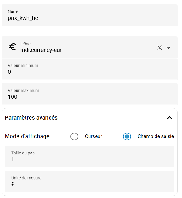 - 2 entrées de type « Nombre » pour enregistrer le prix du kWh en HC/HP