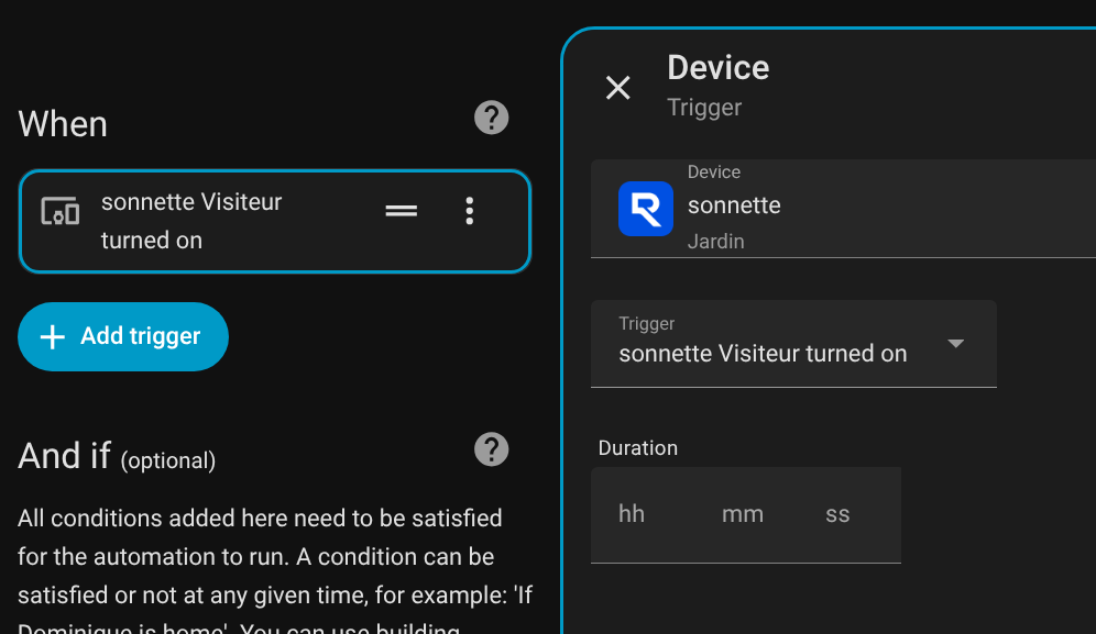 Je vous met en exemple une de mes automations ( attention c’est factorisé plus ou moins à l’extrême pour avoir le code le moins gros possible, attention aussi je me base sur un timer d’affichage de mes cartes conditionnelles sur mon dashboard, pour qu’elles restent affichées 1 minute ).