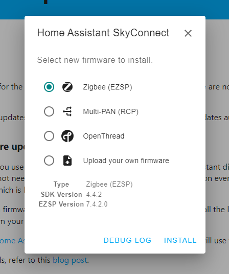 |[2024-07-27 11:44:09] info: |zh:zstack:znp: Opening SerialPort with {path:/dev/serial/by-id/usb-Nabu_Casa_SkyConnect_v1.0_18f1db9ded9aed1182ca7e08a8669f5d-if00-port0 adapter: ember,baudRate:115200,rtscts:false,autoOpen:false}|