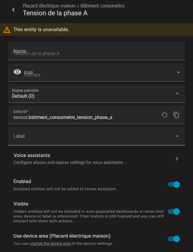 Mais surtout, si je veux corriger / clarifier le entity ID, parfois un peu fantaisiste (ou dans la mauvaise langue), le sensor devient indisponible. Exemple : quand je tente de renommer sensor.batiment_consometre_tension_de_la_phase_a en sensor.batiment_consometre_tension_phase_a, le sensor devient unavailable. Pourquoi ?
