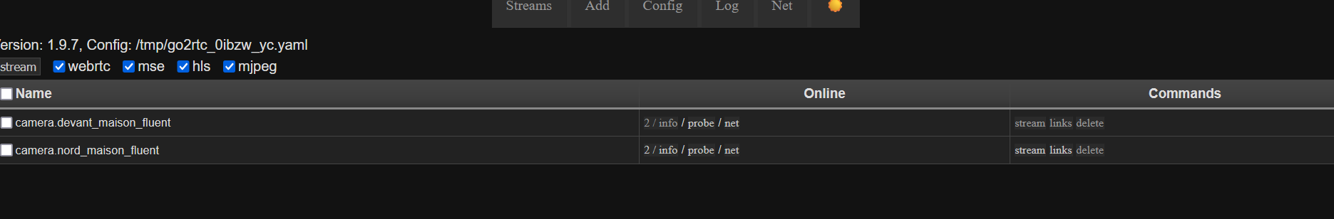 Pour résumer, active et accède à l’UI de go2RTC dans un onglet, lance le flux vidéo de ta caméra depuis HA dans un autre onglet, après un certains temps tu devrais voir apparaître les flux dans go2RTC comme dans mon post (quitte à recharger la page avec F5).