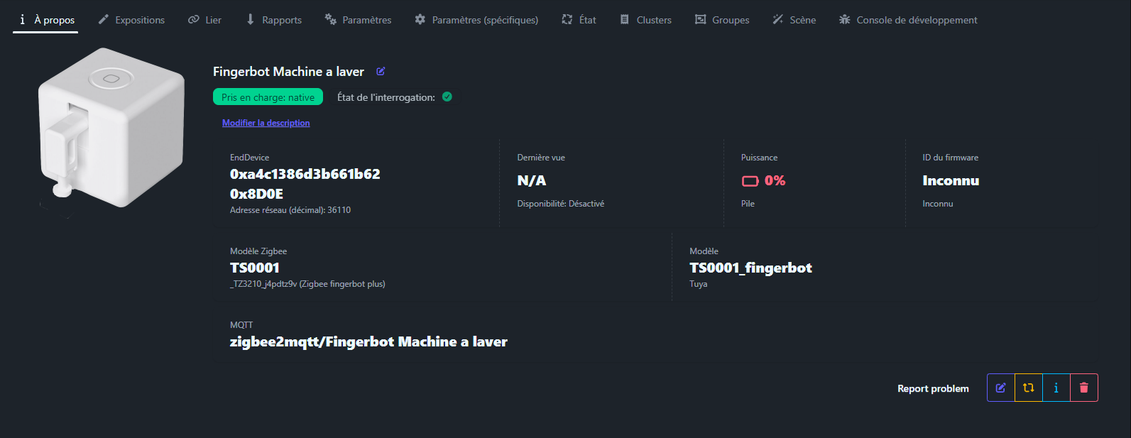 Par contre, depuis que j’ai changé la pile la semaine dernière par une « Duracel long life » et que le Fingerbot n’a pas été actionné depuis, la pile est passée de 100% à 89%.