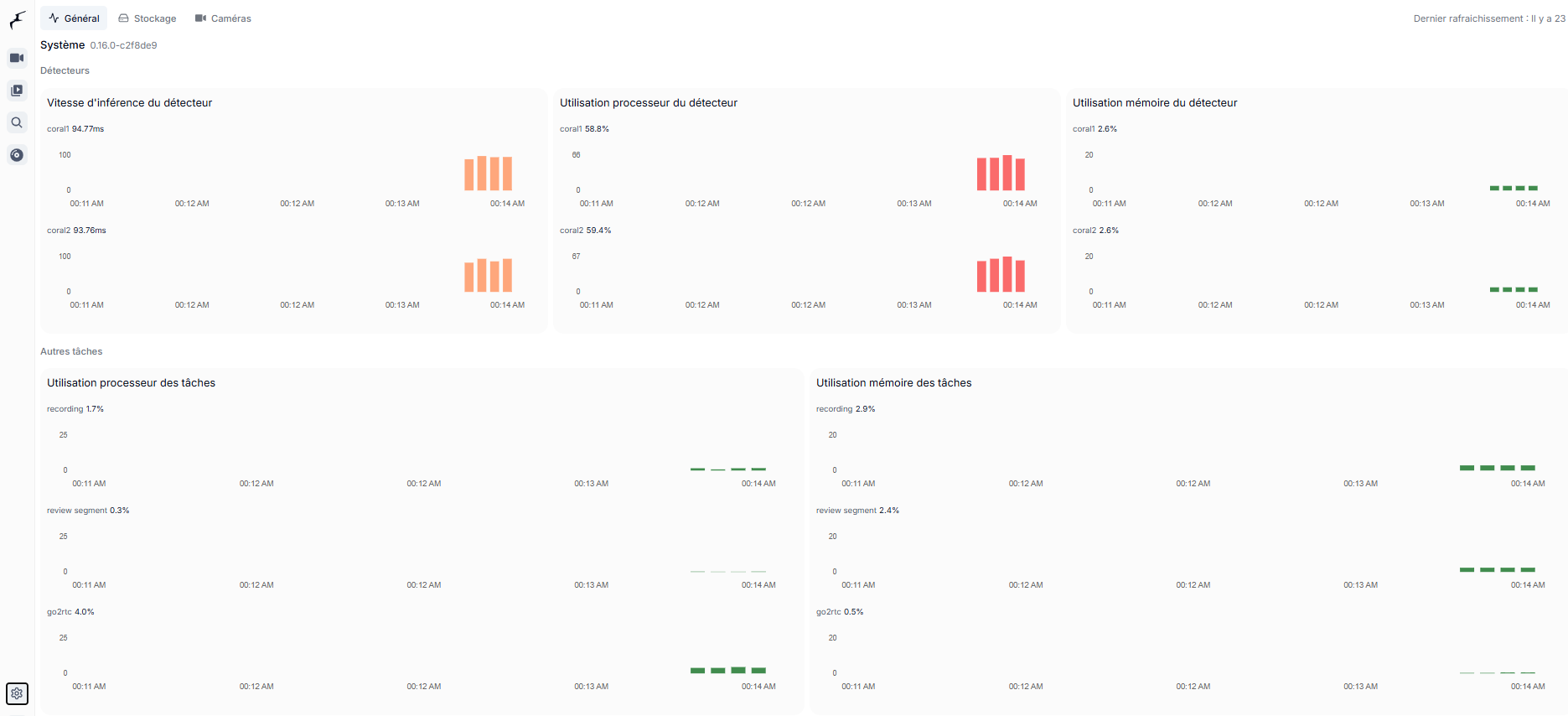 Merci pour ton conseil que je suis actuellement en train de tester. 2 remarques, j’ai cru un instant avoir atteint le graale en voyant des vitesses d’inférence redescendues à 10ms mais c’était sans me rendre compte que la détection pour chaque caméra n’était pas active. En réactivant je reviens à 75ms en ayant tenté de ne pas utiliser Go2RTC. Je dis en tentant car dans les nouvelles versions de Frigate Go2RTC est systématiquement activé donc la seule chose qu’on puisse faire c’est d’utiliser dans la définition le flux RTSP directement (mais Go2RTC fonctionne tout de même). Ou alors y a -t-il un moyen de ne pas faire tourner Go2RTC ? Du coup également est-ce que vous tous qui avez des vitesses d’inférence de 10ms vous avez bien la détection active pour toutes les cameras ?