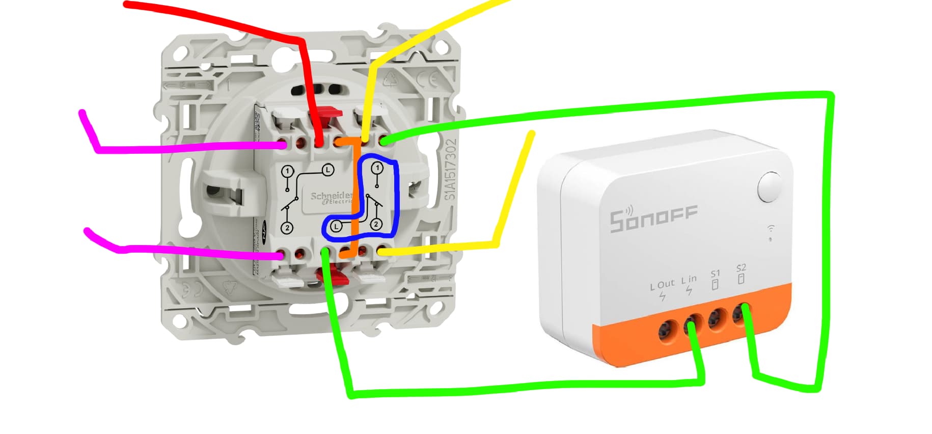Le fil orange est un pont pour alimenter l’interrupteur via son voisin (et c’est avec celui là que je pensais alimenter le module Sonoff)