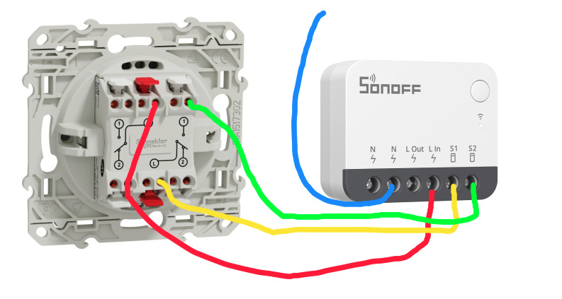 Ensuite, je peux apparemment garder tous mes interrupteurs poussoirs, et mettre un module comme le R2 derrière. Quelque soit le poussoir que j’actionne, le R2 placé dans un de ces boutons réagira. En effet, il se déclenche quand le poussoir est enfoncé, donc quand il reçoit la phase dans son entrée S. Ca peut venir de n’importe quel poussoir par le fil noir. Il faut juste que je mette un R2 quelque part.