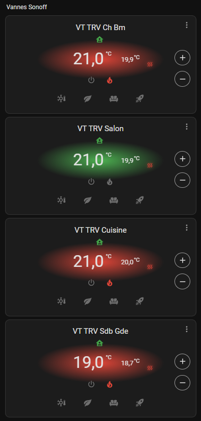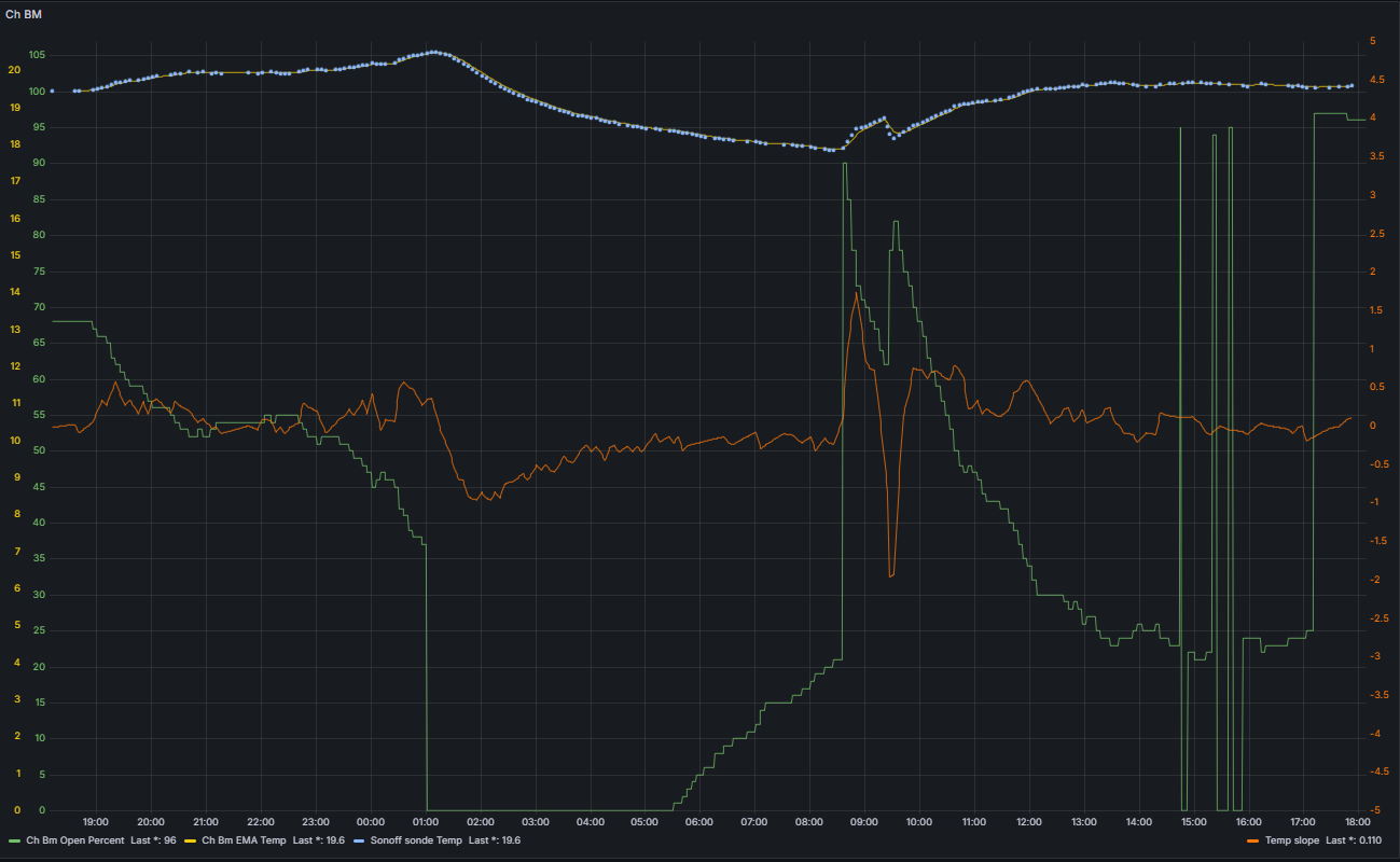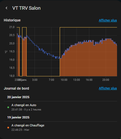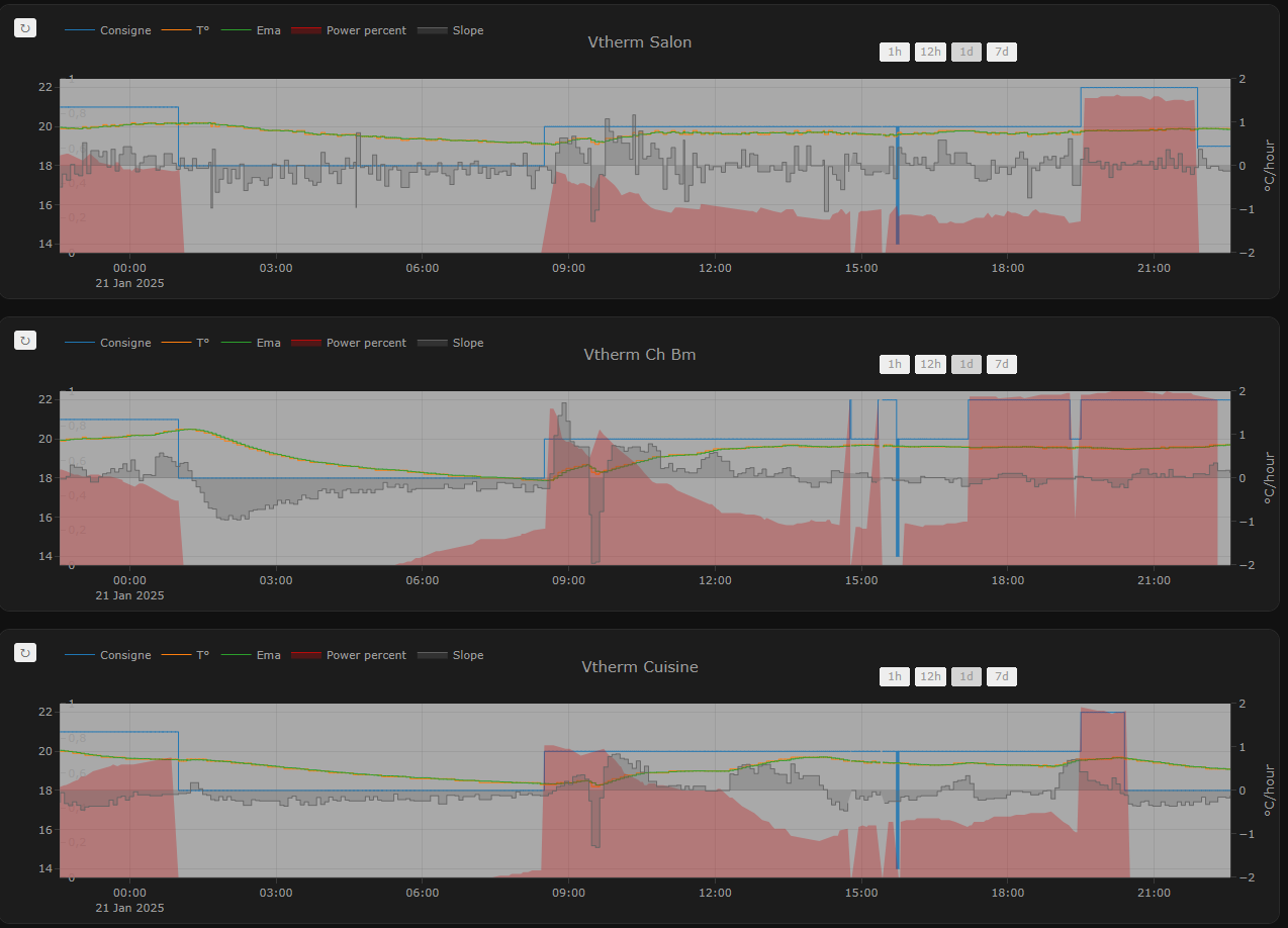 bon, maintenant on va pouvoir analyser un peu le fonctionnement de mes sonoff sous vtherm, je trouve que c’est plutot bien, l’écart de temp sonde et sous-jacent est super bien régulé, les taux d’ouverture semblent cohérents, mais j’ai l’impression que mes radiateurs ne sont pas assez puissants pour atteindre les températures demandées, ce sont des fontes faits pour travailler à 70° avec un chaudière fule et maintenant c’est une PAC qui envoie du 55° max voire un peu plus des fois mais surtout moins dès que la temp extérieure remonte, loi d’eau oblige.