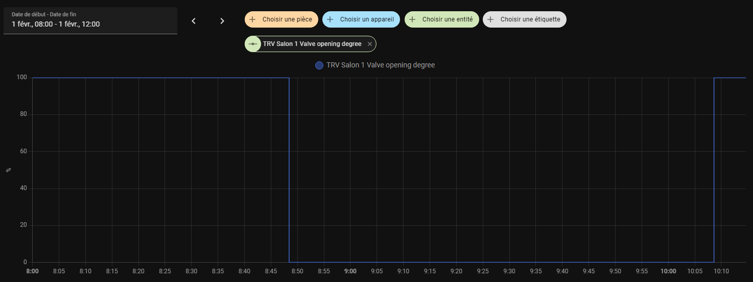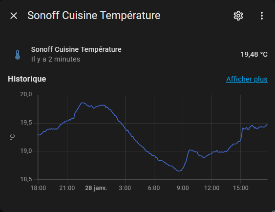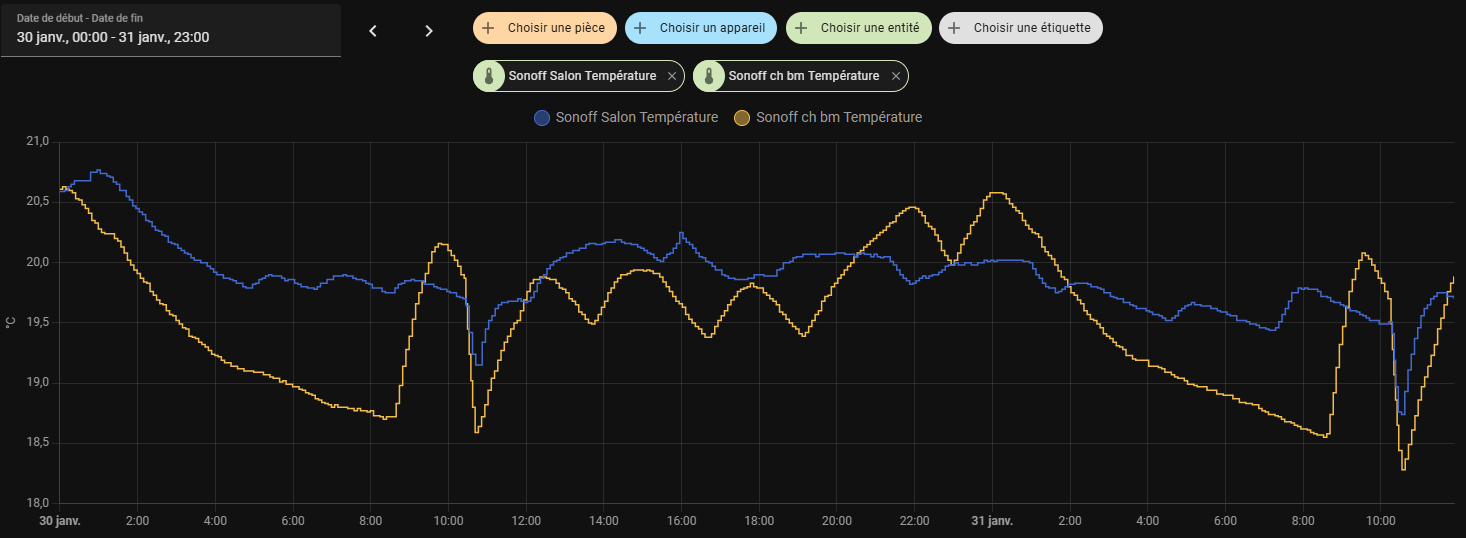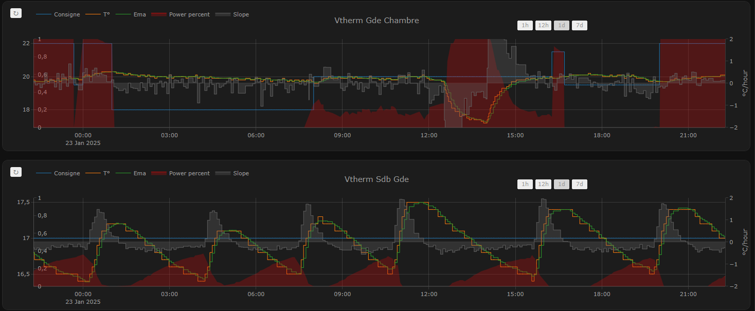 - pour la Sdb Gde la régulation semble trop forte, ça oscille d’un degré autour de la consigne, assez basse à 17 d’ailleurs, seraix un coeff_int à baisser à nouveau sur ce Vtherm ? je vais essayer