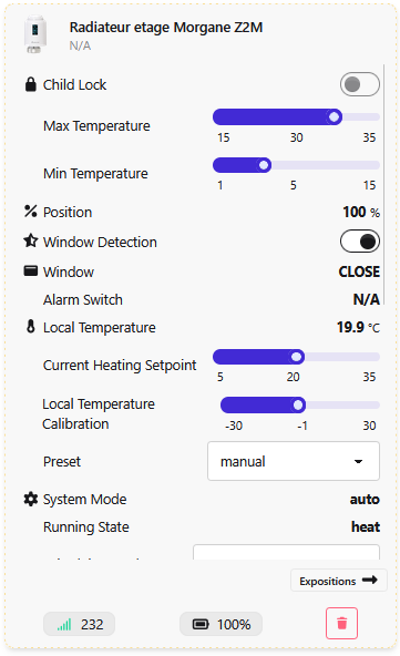 Mais sans y faire vraiment attention je n’ai pas vu un de mes thermostat sur une position intermédiaire c’est toujours 0 ou 100 %. Sur la vue ci-dessus tu ne peux pas agir sur cette valeur