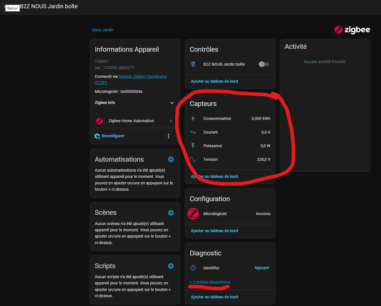 Les informations remontées sont listés dans les capteurs. Attention, il peut aussi y avoir des capteurs disponibles non activés (que tu peux activer en clicquant sur le lien identique à celui que j’ai souligné en rouge) qui apparaît s’il y a des capteurs non activés.