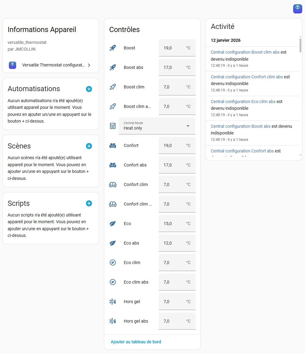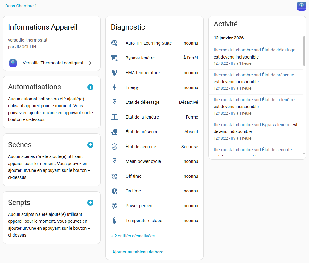Serait il pertinent de mettre en place un fil dédié « Versatile Thermostat - Help-me + pblm rencontré » avec une sorte de cahier des charges des infos minimales de la conf. du demandeur, ou mieux, un « bouton » dans Vth qui exporte uniquement les valeurs nécessaires à poster (anonymisées si besoin), et qui permettrait de résoudre le problème sans demander telle ou telle valeur de la conf ?