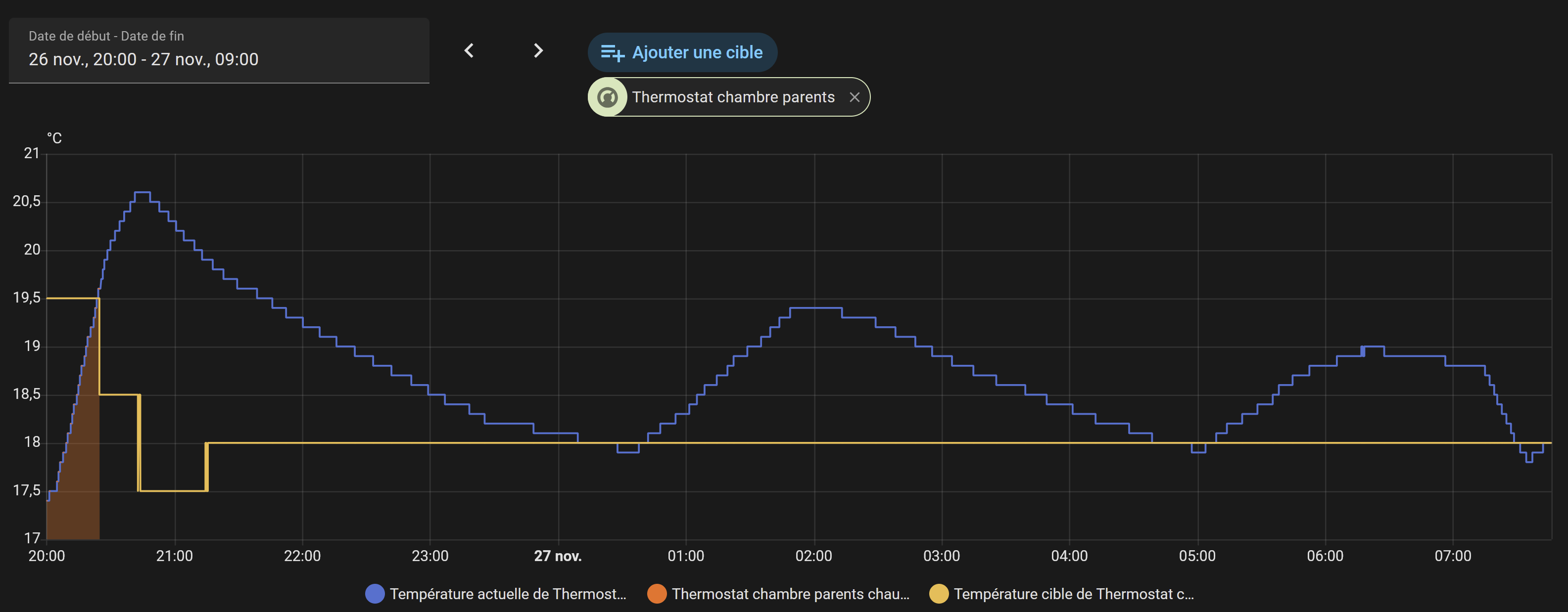 Typiquement, dans l’image, entre les 2 périodes de chauffe, le split soufflait quand même de l’air chaud. D’ailleurs, juste avant 18h, quand je suis allé voir le split, il soufflait de l’air chaud alors que le graphe semble dire que ce n’est pas le cas.
