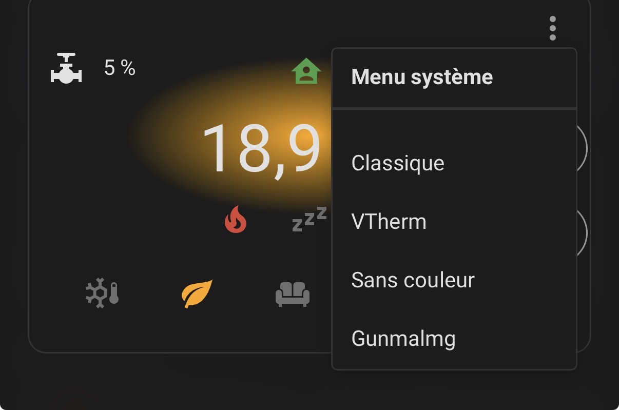La VTherm UI Card propose un thème minimal nommé Gunmalmg (comme le nom du contributeur qui l’a inspiré). Vous pouvez retrouver le thème classique sous la forme d’une popup en cliquant sur les températures. Cf. readme
