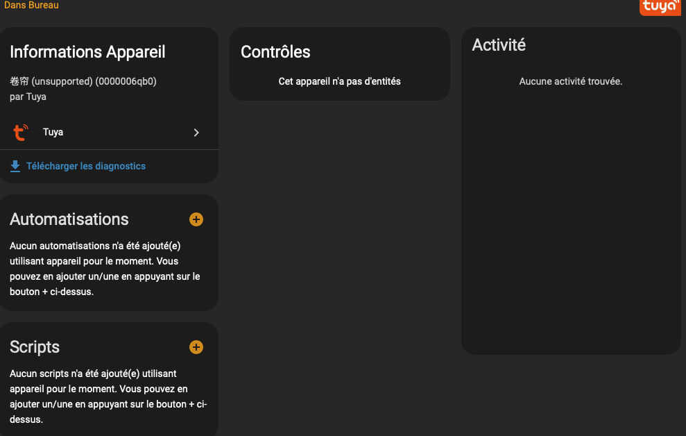 A chaque jour son nouveau défi sur HA, aujourd’hui j’aimerais connecter sur HA mes volets roulant de marque AOK, j’ai bien la box domotique qui me permet de gérer les volets via tuya, je vois bien dans tuya mes volets mais voila à quoi ca ressemble quand je click sur l’appareil, une idée pour le contrôler depuis HA?