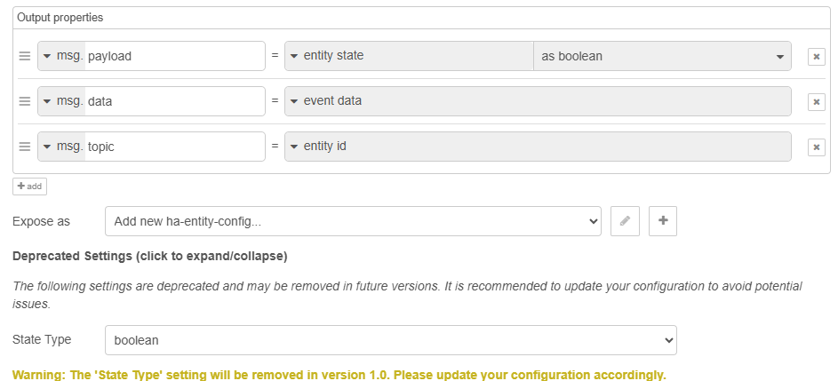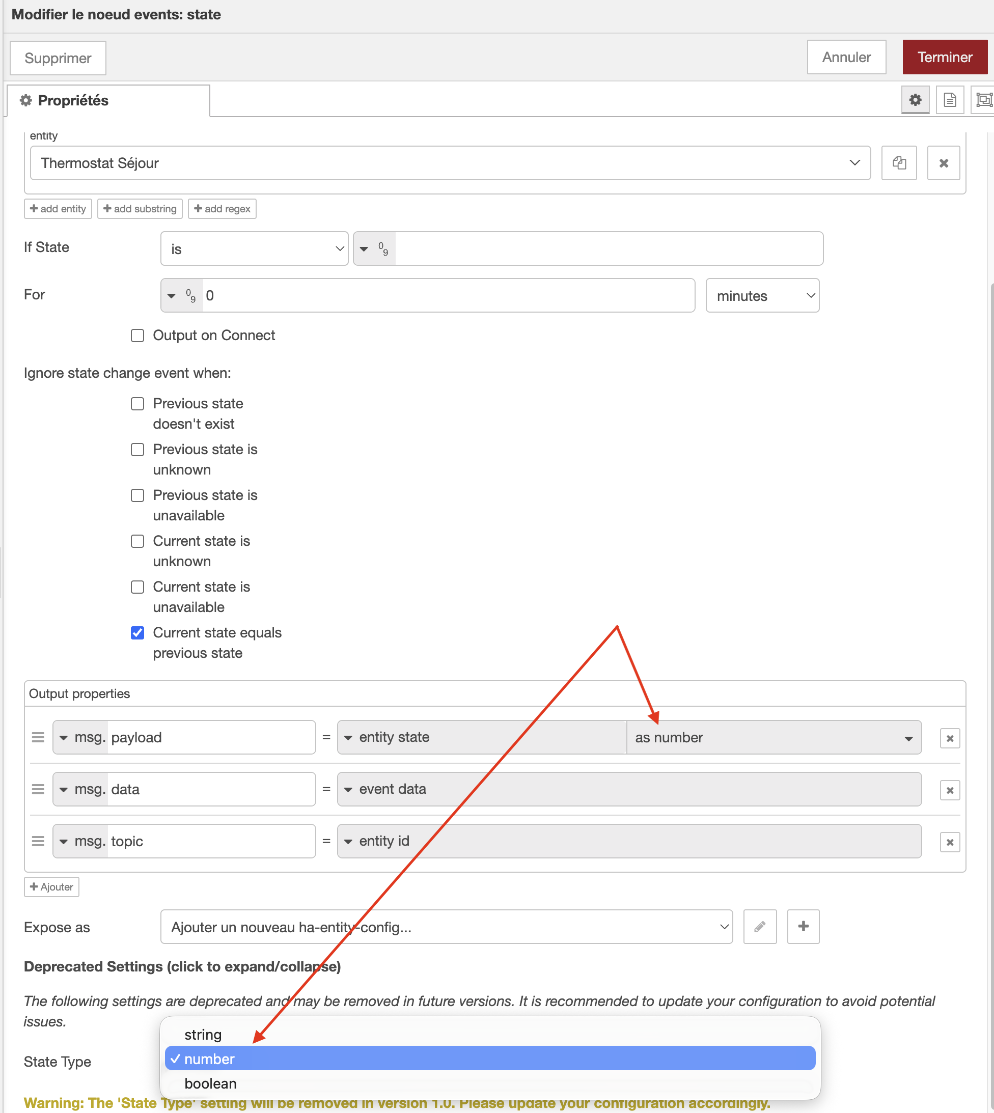 Si j’ai bien compris le changement, le state type, sue tu as en bas, c’est ce que tu avaid dans ton noeud. Celui-ci disparaitra et est remplacé par le sélecteur de type dans la config du msg.payload.