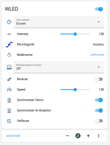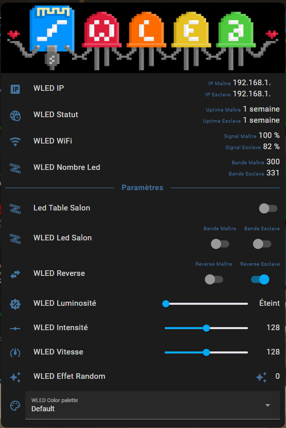 j’ai fait une carte popup avec entities card, mais tout fonctionne. Les effets, color palette, reverse , on/off … Je les utilisent avec l’intégration WLED de HA.