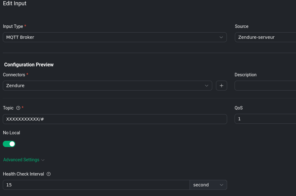 Allez dans « Data Inputs » à droite et cliquer sur message (topic:t/#) et remplir comme cela:
