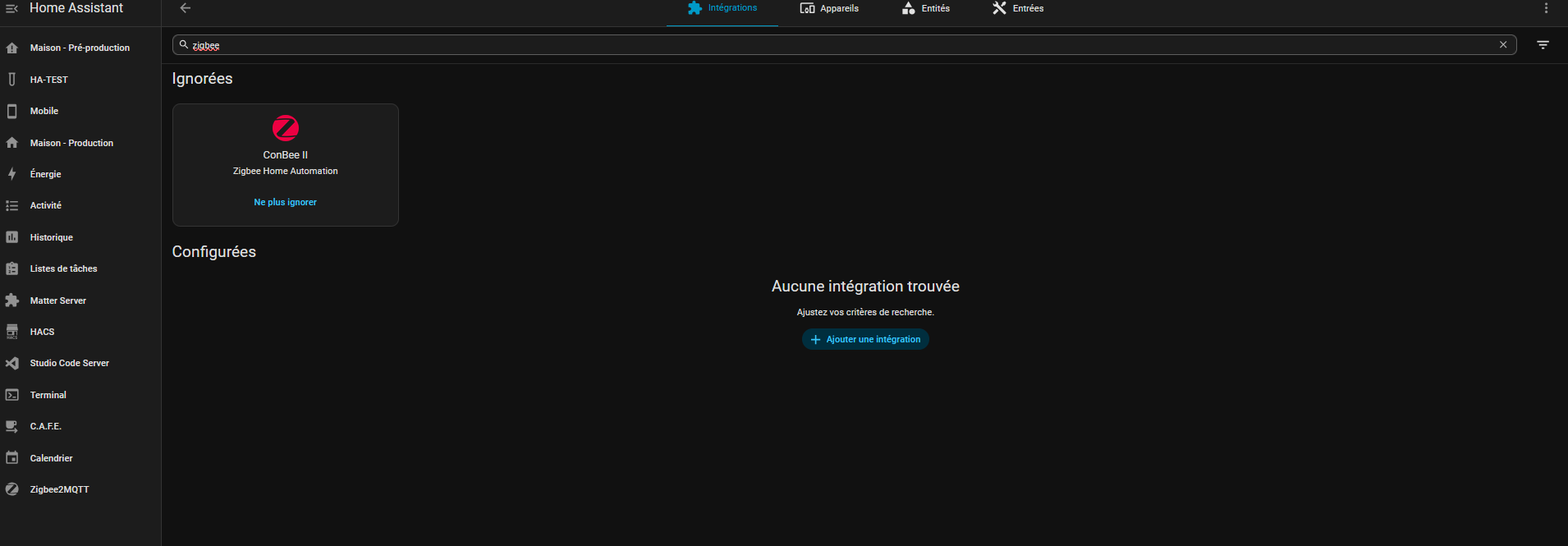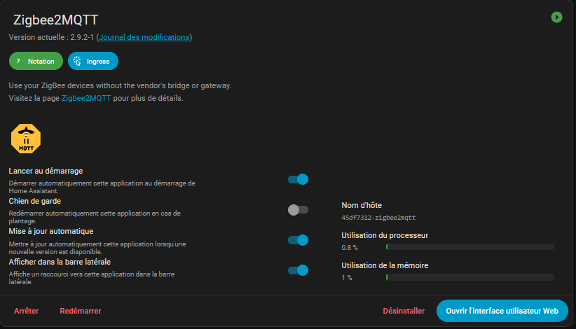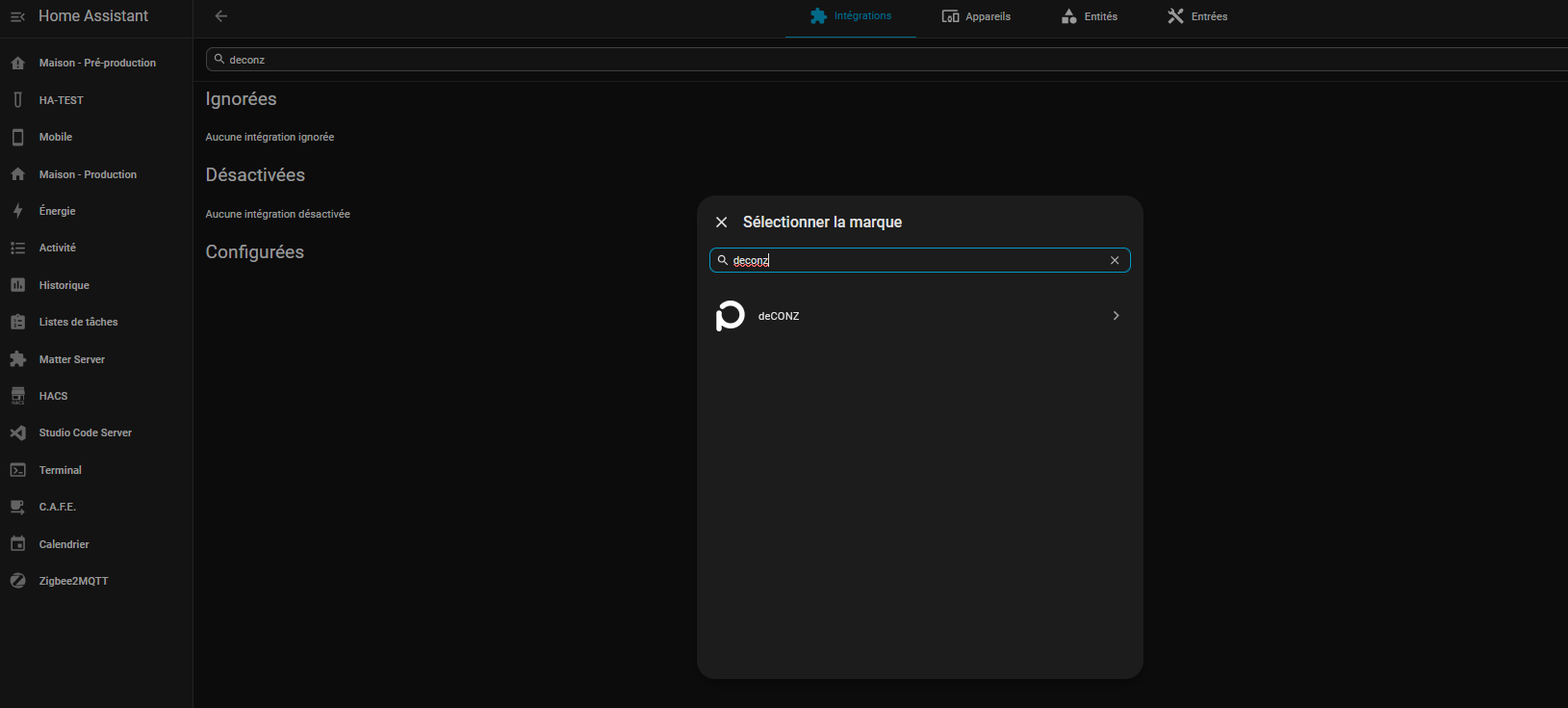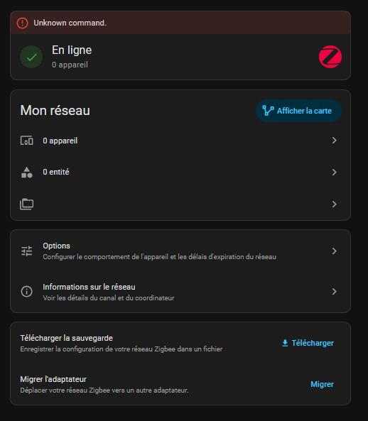 De plus j’ai eu l’apparition de l’icône « Zigbee » dans les paramètres de Home Assistant sans pouvoir effectuer d’action.