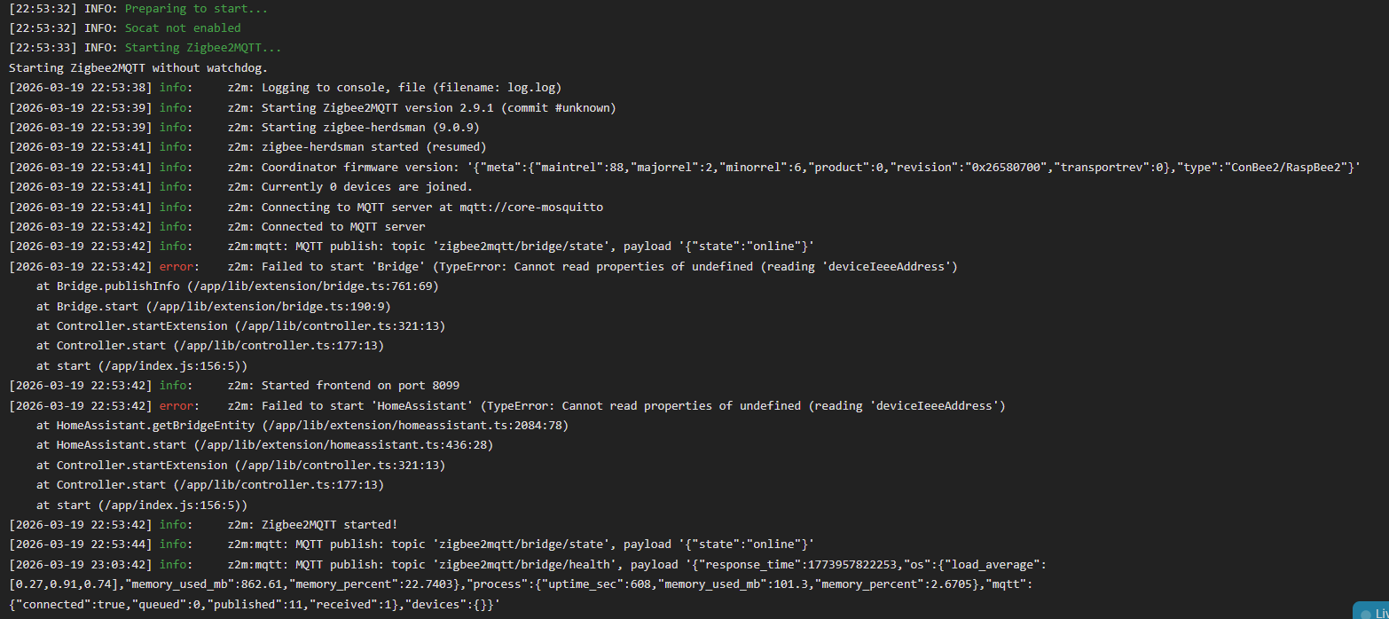 [2026-04-14 22:26:43] error: z2m: Failed to start 'HomeAssistant' (TypeError: Cannot read properties of undefined (reading 'deviceIeeeAddress')