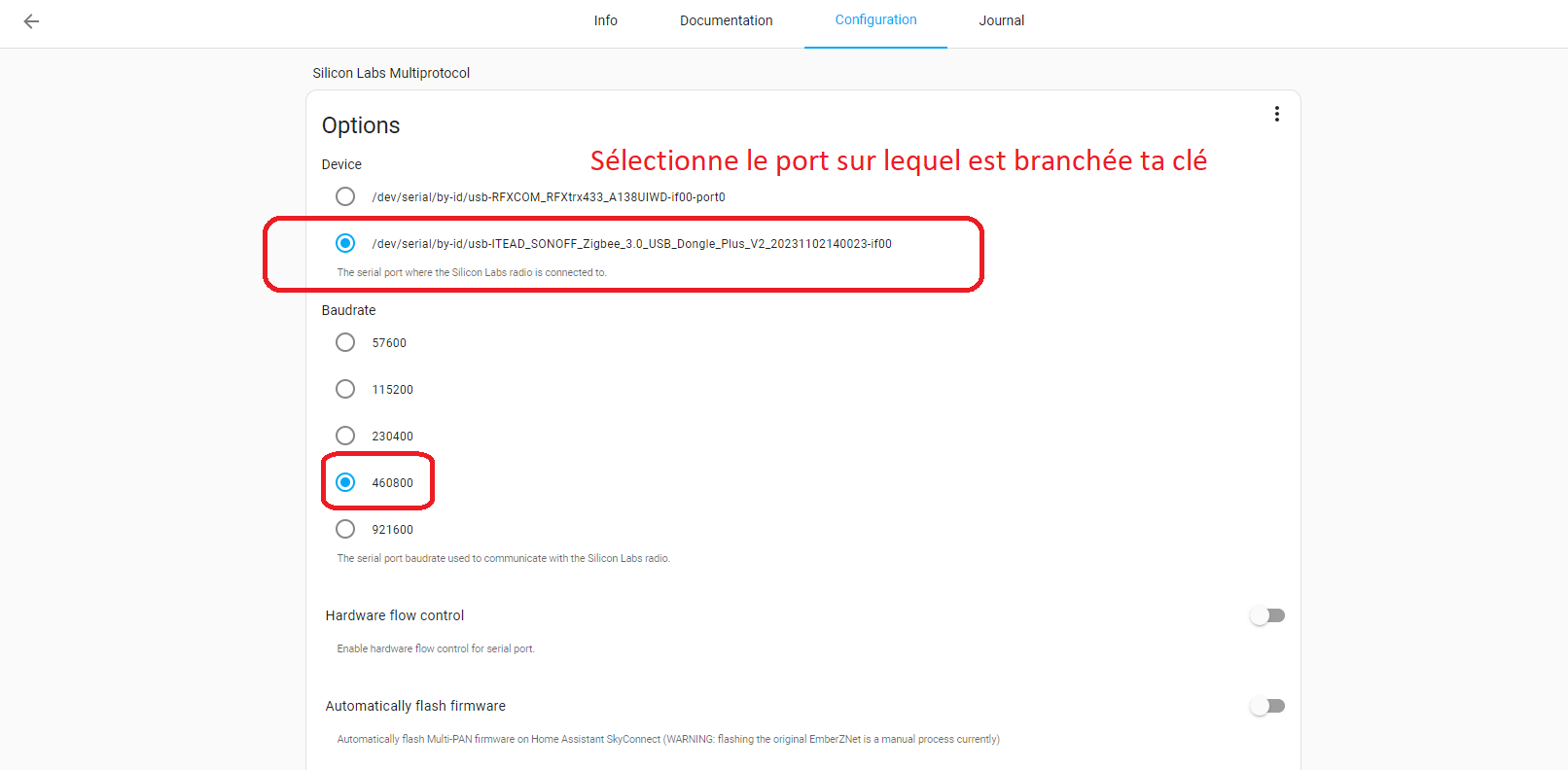 A priori, tu peux, depuis l’onglet configuration de l’addon, cocher une option pour flasher automatiquement le firmware des clés SkyConnect :