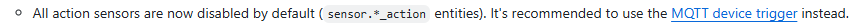 Si tu utilises des entités *_action ou *_click, elles sont supprimées sur la v2.0.0. Il faut passer par le MQTT trigger en v2.0.0.