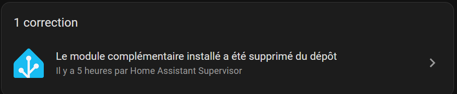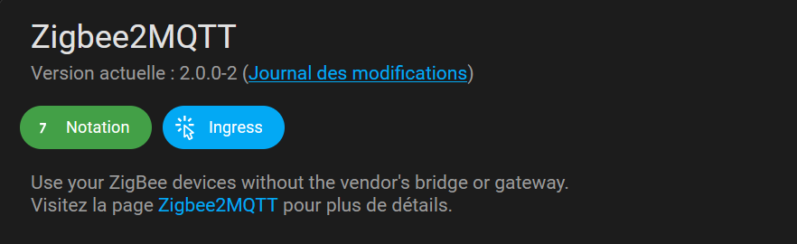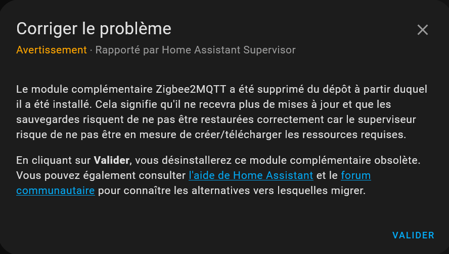 En retour, le module Zigbee2MQTT a été complétement supprimé avec comme conséquence que la plus part de mes appareils se sont retrouvés dans un état « indisponible ». Enorme panique d’autant que la nouvelle version Zigbee2MQTT V2 n’apparaissait plus dans la bibliothèque des modules complémentaires.