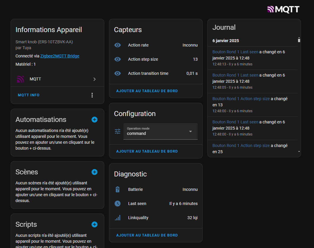 [2025-01-06 12:48:13] info: z2m:mqtt: MQTT publish: topic 'zigbee2mqtt/Bouton Rond 1', payload '{"action":"brightness_step_down","action_rate":null,"action_step_size":13,"action_transition_time":0.01,"battery":null,"last_seen":"2025-01-06T11:48:13.112Z","linkquality":32,"operation_mode":"command"}'